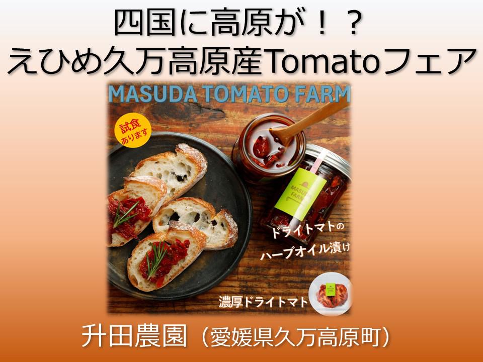 2026/3/18~24四国に高原が!? えひめ久万高原産Tomatoフェアー♪高原の朝晩の寒暖差と、高い山の湧き水で育てる、旨味の強い久万高原トマト。その旬のおいしさをそのまま凝縮したトマト商品です。栄養価の高いトマトを冬でも美味しく。そのまま食べてもお料理に活用しても。20倍に凝集されてるので少しでもすごくコクがでて極上の美味しさに! 【升田農園(久万高原町)】